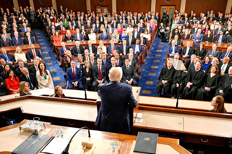 US President Donald Trump was expected to use his State of the Union address yesterday to champion his immigration crackdowns, his slashing of the federal government, his push to preserve widespread tariffs that the Supreme Court just struck down and his ability to direct quick-hit military actions around the world, including in Iran and Venezuela.