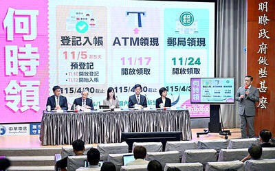People can preregister to receive their NT$10,000 (US$325) cash distributed from the central government on Nov. 5 after President William Lai (賴清德) yesterday signed the Special Budget for Strengthening Economic, Social and National Security Resilience, the Executive Yuan told a news conference last
