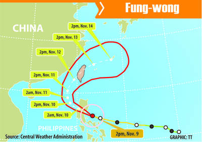The Central Weather Administration (CWA) yesterday said it expected to issue a sea warning for Typhoon Fung-Wong tomorrow, which it said would possibly make landfall near central Taiwan. As of 2am yesterday, Fung-Wong was about 1,760km southeast of Oluanpi (鵝鑾鼻), Taiwan’s southernmost point, moving