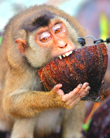 Monkeys do more than just monkey around. They also help people with important work. In Thailand, coconut farmers often teach monkeys to pick coconuts from tall trees. This monkey has just returned from picking a coconut for his owner.