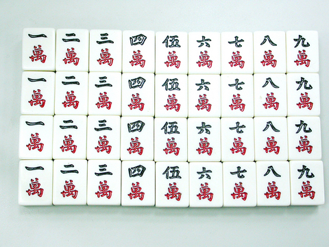1. There are three kinds of suit tiles, one kind showing a line, another a dot, and another a character. In Chinese we call them 索 (suo3), 筒 (tong3), and 萬 (wan4) respectively.