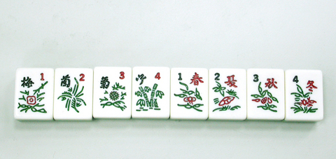 The tiles mean: plum, orchid, bamboo, chrysanthemum, spring, summer, fall and winter. In Chinese they are written 梅 (mei2), 蘭 (lan2), 竹 (xhu2), 菊 (ju2), 春 (chun1), 夏 (xia4), 秋 (qiu1), 冬 (dong1) respectively.