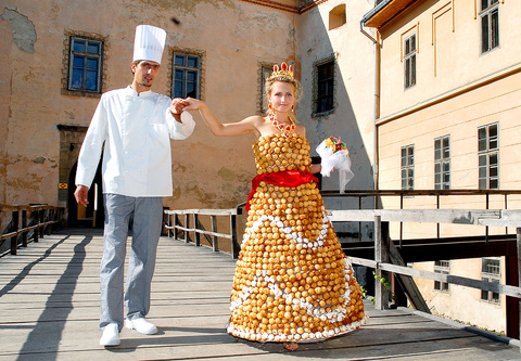 烏克蘭的麵包師傅瓦倫汀.席方諾賦予這個諺語新的意義。這張照片是他與自己的新娘子維多莉亞的照片。她穿著獨樹一幟的結婚禮服,是席方諾用麵粉、糖、雞蛋與焦糖所烤出來的。這件禮服是由一千五百個奶油泡芙製成,讓這位麵包師傅花了約兩個月才完成。它看起很美,讓人很想吃一口,最棒的是,你真的可以吃!