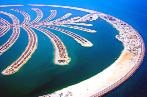 朱美拉棕櫚島狀似棕櫚樹,是幾座填海人工島嶼的第一座成品,幾哩之外,「世界島」的工程也在進行中。它由三百多個島嶼組成,就像地球上的國家一樣。
