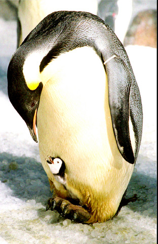 卵孵化成功後,企鵝父母會以肚裡的食物餵食幼企鵝,如同這張照片一樣。