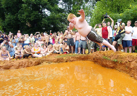 The top favorite was evidently the mud-pit belly flop. Contestants with a large beer gut - and there are quite a few- - have a marked advantage as they produce a bigger splash when they land belly first in the pit filled with muddy water.