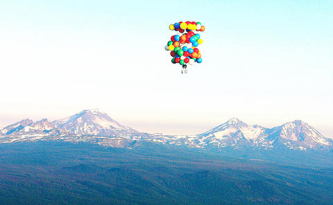 為了降落,他戳破了好幾個氣球。當他跳出來時,風捲走了剩下的氣球,他的攝影機與草坪椅也隨風飛逝了。 (翻譯︰賴美君)