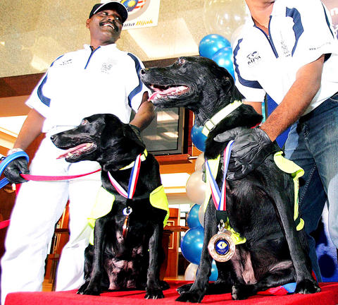 歷經六個月,在馬來西亞一嗅成名的拉布拉多獵犬「來福」和「小花」,由於協助查緝盜版光碟立下了大功,上星期一獲頒「傑出服務」獎章。