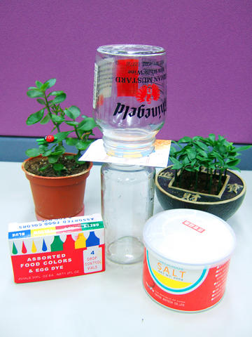 ■ 將一個瓶子(A瓶)倒入四分之三溫的自來水,再加入滿滿一匙的鹽巴,並攪拌均勻至鹽巴完全溶解在水中。接著,滴入數滴紅色色素,攪拌均勻。