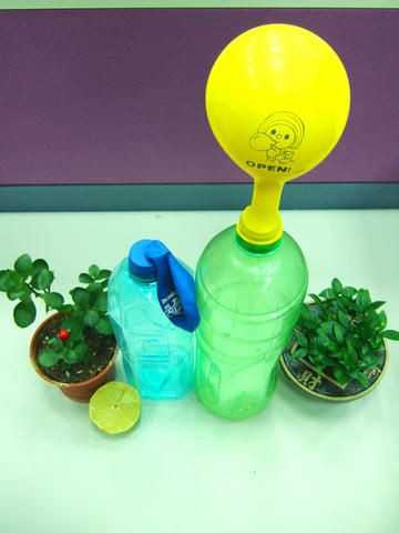 ▲ 再拿出兩個氣球,其中一個在用之前先拉一拉,這是這個實驗微妙的部份。將剛剛榨好的檸檬汁分別裝入小寶特瓶,然後用最快的速度將氣球套封上瓶口。