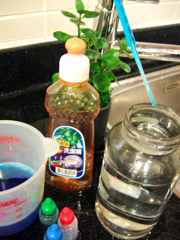 ▲ 在碗中裝入一些溫水,加入幾滴洗碗精。若你準備了食用色素,現在可以加入一滴,然後輕輕攪拌。