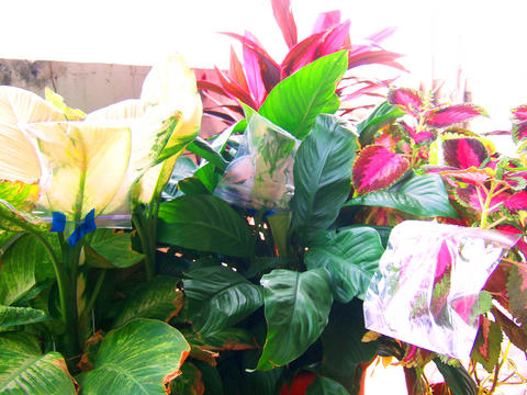 ▲將塑膠袋套在每一株植物的其中一片葉子上,然後將袋口封好,讓水氣不容易跑掉。請小心不要把葉柄給壓壞了。