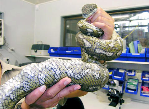 An undated photo of a keeper holding the snake at the Currumbin Wildlife Sanctuary. 可倫賓野生動物保育區內一名飼養人托著那條蛇的照片,未註明拍攝日期。 照片:美聯社 PHOTO: AP |