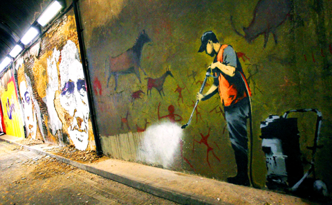 本月初,塗鴉活動主辦者班克希和許多游擊噴漆藝術家在倫敦南部一條荒廢隧道的牆面上,畫滿了各式特別的塗鴉壁畫。