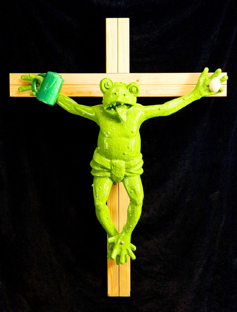 一隻綠色青蛙被釘在十字架上,一手拿著啤酒,另一隻手上則握著一顆蛋;這件馬丁.齊潘柏格的雕塑作品,目前正在義大利北部的波札諾市當代美術館展示。
