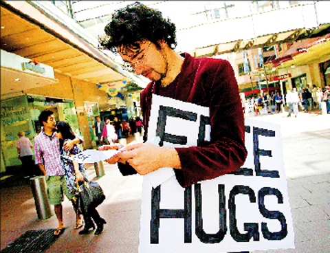 Mann, who spends about one day a week holding a ‘FREE HUGS’ sign above his head in Sydney’s Pitt Street Mall, has inspired free hugs movements around the world. (AFP)