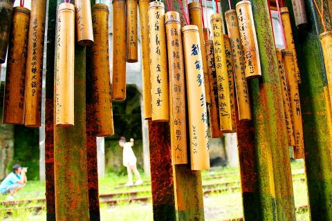 According to Hong Jin-feng’s Taiwan Folk Culture Journey published in 1993, sky lanterns are also called “Kung Ming lanterns.” Legend has it that lanterns were created in the shape of China’s legendary minister Chu Ke-liang’s (aka Kung Ming) hat by Chu himself during the Three Kingdoms period (184-280 AD) as a way of communication during periods of war. As to why sky lanterns have become synonymous with Pingsi, legend has it that Chu’s offspring settled down in Pingsi where they set off sky lanterns annually around the Lantern Festival to pay homage to their ancestor. According to another story, many years ago, the Shihfen area was infested with bandits and robbers, so villagers set off sky lanterns to indicate they were safe after the bandits had left. As a result, sky lanterns are also known as “safety lanterns” or “prayer lanterns.” Overall, sky lanterns symbolize prayers for peace and happiness. Interestingly, the pronunciation of sky lanterns in Hoklo is a homonym for tian din, or “adding a child.” Thus, many couples who want to have children set off sky lanterns to pray for good luck.