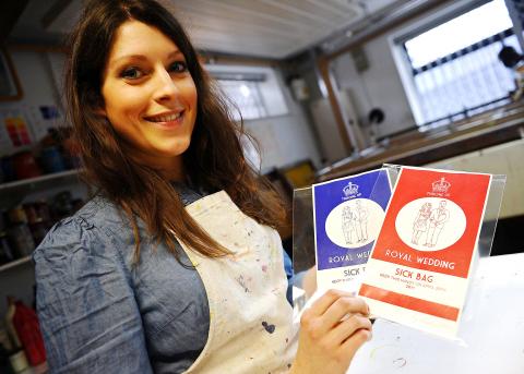 The items, costing three pounds (NT$144) each, are genuine air sickness bags, with the added royal twist.