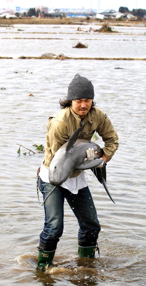 日本《朝日新聞》週三報導,一隻新鼠海豚三月十一日被日本海嘯襲捲到內陸,日本動物救援志工在離海兩公里的稻田中救出這尾鼠海豚。