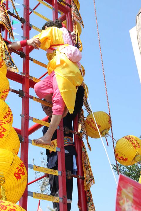 Beitian Temple in Hualien County’s Jian Township held a ceremony to bring blessing to locals last Saturday. A 33-meter-high ladder, about the height of a 12-storey building, whose rungs were made with 108 swords, was erected on the main square. Ten worshipers who applied to take a test to be Taoist masters at the ceremony climbed the ladder’s steps one after another under the supervision of a temple official and a senior Taoist master.
