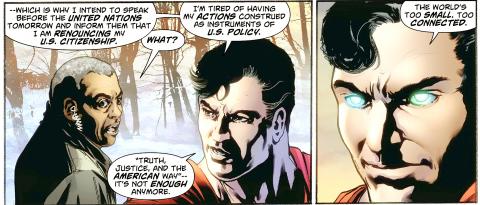 超人說:「這就是為何我打算明天在聯合國面前告知他們我要放棄我的美國國籍。」他說,「『單憑真理、正義與美國之道』已不敷使用。」