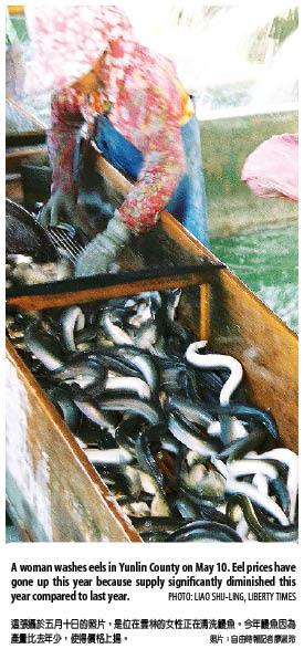 One kilogram, or about four to six eels, is sold at as much as NT$920. However, the eel market is still proving profitable even though supply is unable to meet demand. The president of an eel cooperative in Yunlin County said the price per kilogram used to be under NT$700, but is expected to rise beyond NT$1,000 by the end of May, which means consumers will have to shovel out more money if they still wish to enjoy fresh eel.