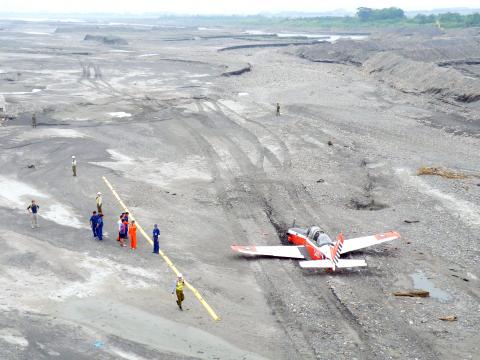The Air Force Academy said the single-engine aircraft took off from the academy’s runway in Greater Kaohsiung’s Gangshan District at 11:01am. The engine failure occured at 11:16am. They originally decided to land on another airbase in Pingtung County, but since it was too far, Lai decided to crash-land on an open sand field in Kaoping River. They finally landed 27km east of the Air Force Academy airport at 11:26am. After landing the aircraft layed flat on its belly on the riverbed.