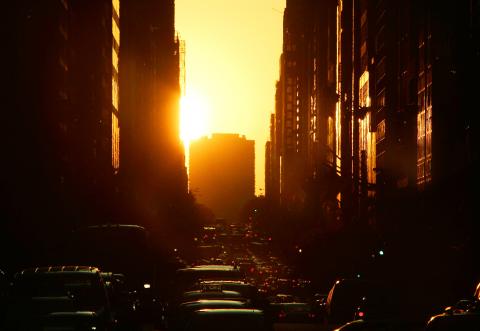 被命名為「曼哈頓巨石陣」的現象,一年只出現兩次,這是太陽日落角度,與曼哈頓棋盤街道對齊,完美貫穿紐約街頭,放射絢麗奇幻光芒。