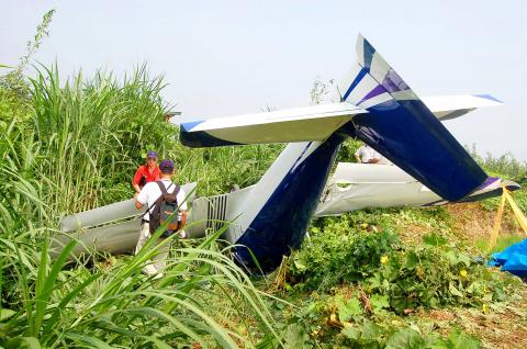 Kuo Hsiang-pin, the owner of a dyeing and finishing factory, crashed his ultralight aircraft into a lychee orchard in Changhua County on Sept. 21 following suspected mechanical failures. Only the frame of the aircraft was left after the fire was put out. Kuo was sent to Changhua Christian Hospital in critical condition for emergency treatment.