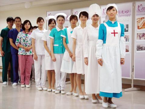 At the fashion show, employees wore old Florence Nightingale-style nurse uniforms, nurse uniforms with puffy sleeves, as well as the current uniform of round-collar shirts with pants. One of the nurses, Yang Ya-li, said today’s nurse uniforms consist of pants, which makes things much more convenient, adding that different hospital departments have various styles and colors of nurse uniforms.