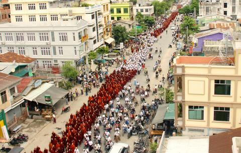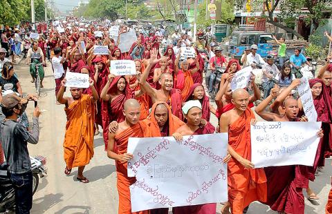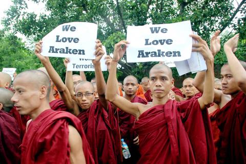 僧侶們舉著標語牌,上面寫著︰「支持總統,拯救緬甸祖國。」總統登盛七月間提議,緬甸將所有羅興亞人送到任何願意接受他們的國家,該提議隨即遭聯合國難民署反對。