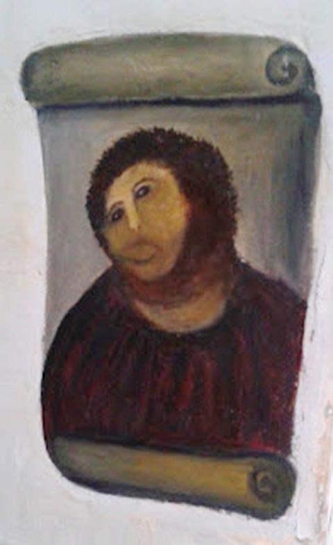 這位出於一片好意、手藝卻不太靈巧的業餘畫家高齡八十多歲,她自作主張地想要修補這幅斑駁的畫像,在原作上重新上色,這幅作品描繪的是頭戴著荊棘冠冕、眼神哀傷望向天堂的耶穌。