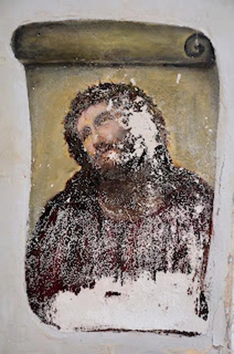 The well-intentioned but ham-fisted amateur artist, in her 80s, took it upon herself to fill in the patches and paint over the original work, which depicted Christ crowned with thorns, his sorrowful gaze lifted to heaven.