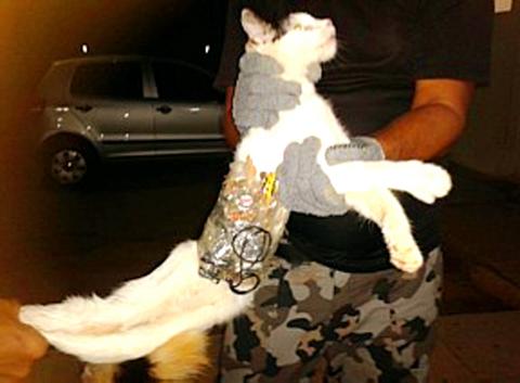 A cat has been detained in the grounds of a jail in Brazil with contraband goods for prisoners strapped to its body with tape.