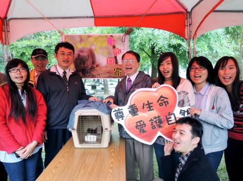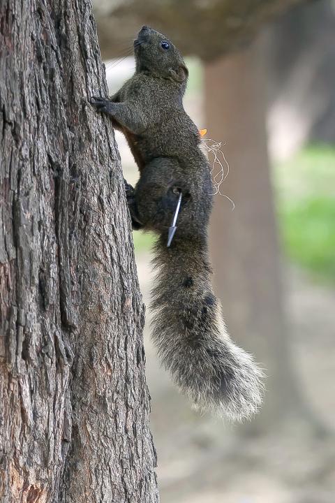 A squirrel shot with a crossbow arrow on the campus of National Tsing Hua University has returned home. Students spotted the squirrel on campus last month with a metallic arrow 20cm long sticking though its body. Despite being injured, the squirrel was still lively, running around in the trees and even competing with pigeons for food. The university hired representatives from the Hsinchu Zoo to help capture the squirrel and take it in for treatment. After veterinarians from the zoo surgically removed the arrow from the squirrel, it was kept under observation for two weeks. The squirrel was released back into the wild at the university on April 1. Hsu Hung-yi, chief officer of the Hsinchu Zoo, says that after the arrow was removed, the squirrel made a quick recovery and regained its sprightliness and appetite. The best way to rehabilitate the squirrel was by returning the rodent to its most familiar environment, Hsu says.