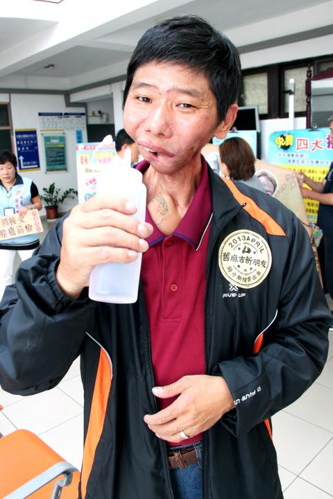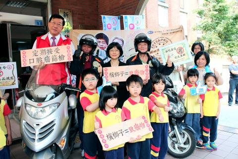 With no tongue, a fake chin and a hoarse guttural voice, oral cancer patient Chou Pei-yuan rode his scooter with his friend Tsai Wei-kuo, who also has oral cancer, to Hsinchu County on April 29 on his way around Taiwan to talk to children, using an interpreter, telling them to advise their fathers and uncles to give up their cigarettes and betel nuts and warning the kids to never touch the stuff when they grow up.