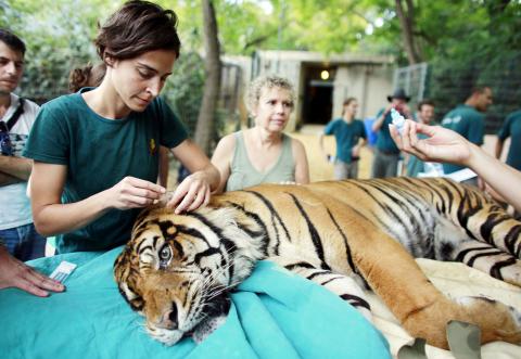 獸醫師正試圖以針灸治療以色列一家動物園的一頭蘇門答臘虎。