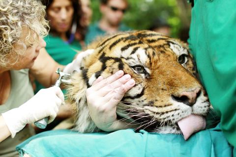 這頭名叫「潘當」的十四歲老虎飽受長期耳朵感染之苦。六月九日,一名全人醫學專家嘗試對牠針灸,在牠的耳朵與身體其他穴道扎入數根粉紅針。在治療中,這頭老虎獲舒緩平靜。