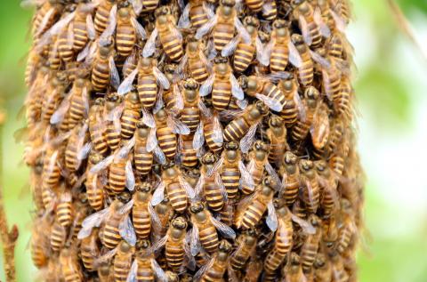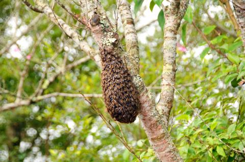 Tsai Nu-jen says that this particular swarm of honeybees from China was in the middle of swarming. Once a group of honeybees grows large and strong enough, it produces a new queen, he says, adding that the old queen leaves the colony and takes a swarm of bees with her, which gathers on a tree until the swarm is complete. Then it prepares to move to a suitable location to make a new colony, while the old colony is left to the new queen bee. The phenomenon of swarming is most commonly seen in the spring, particularly among wild Chinese honeybees. The so-called ball of bees is only a temporary gathering — a natural phenomenon that should not alarm people. Swarming means that a group of honeybees is gradually getting stronger. Seeing a group of bees swarming in the wild is good news, especially in recent years with increasing numbers of bee colonies disappearing.