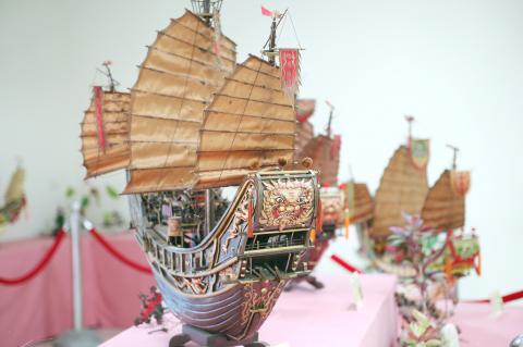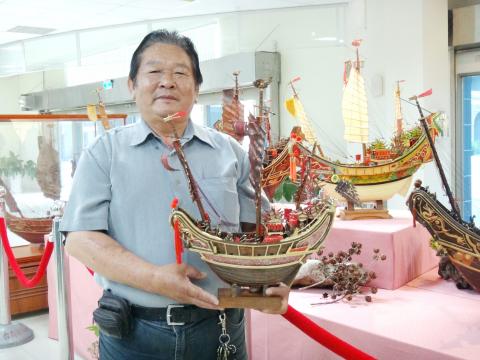 Lo De-sheng, 64, worked as a sailor as a young man. Three decades ago he happened to see a Wang Yeh boat on the river, which left him awestruck and deeply moved. Living at the seaside has also frequently exposed him to the religious beliefs surrounding Wang Yeh ships — ships built as part of plague offerings to the Wang Yeh plague gods. After retiring a little over a decade ago, Lo threw himself into making miniature Wang Yeh ships. The materials he uses include scrap wood, toothpicks, resin and disposable chopsticks, applying the techniques of folding, pasting and carving to sculpt detailed, realistic ship art pieces. The amateur artist’s stunning works of art are on display for three months at the art gallery on the first floor of Greater Tainan’s Anping District Office, giving people the chance to take a closer look at these exquisite examples of traditional culture.