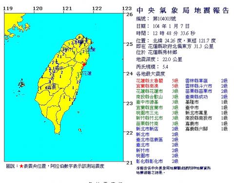 星期二中午十二點四十八分,花蓮縣秀林鄉出現起芮氏規模高達五點四的地震,宜蘭有五級震度,台北雖僅二級,但搖晃程度頗大,延續十幾秒,立院交委會進行中,與會人員都感到搖晃威力,之前與之後幾分鐘連續出現四個規模三點五到三點八的地震,震央都在原來震央一到二公里內,總計四十九分鐘內,同地點附近高達五起地震。