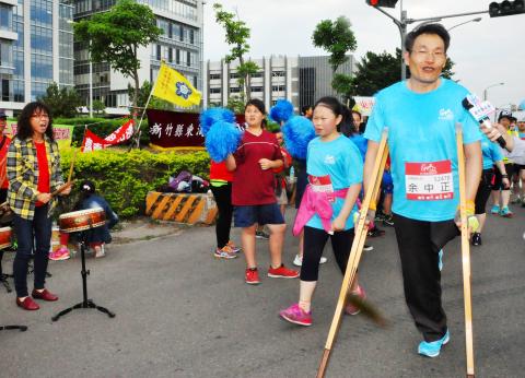 從宜蘭縣來參加挑戰組比賽的余中正拄著柺杖單腳上場,熱愛路跑的他雖因車禍失去左腳,但仍不放棄這項運動,而且有比賽就盡量參加;他說:「少了一隻腳雖然跑的慢一點,但也要繼續跑下去。」
