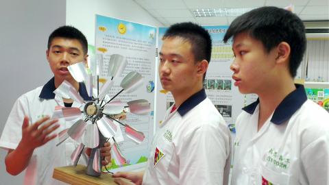 Saint Aloysius Technical School in Hsinchu County’s Sinpu Township attracts new students with its emphasis on hands-on instruction to develop students’ potential. Three first-year students in the Department of Electrical Engineering — Tseng Chun-hao, Chang I-feng and Yu Ping-chi — took part in this year’s national high school science fair and won an honor in the Taoyuan, Hsinchu and Miaoli counties group with their mini wind turbine. The turbine, which explores the application and effects of relative rotational speed, was a favorite of the judges.