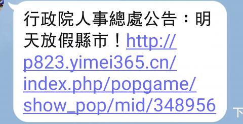蓮花颱風之後又有昌鴻颱風接力,許多民眾期待能放颱風假。昌鴻颱風上週五最靠近台灣,但上週二網路卻已出現山寨版的放假公告,標題為「行政院人事總處公告明天放假縣市」。網友點選後發現是中國網站,懷疑藏有惡意病毒程式,呼籲大家別點選,並指出正確放假資訊可上行政院人事行政總處網站或通過新聞媒體查詢。