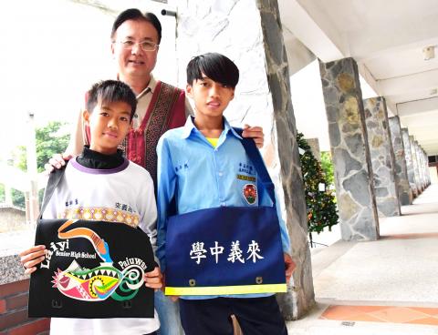 The old bags, which have a blue background and white characters and which have been used for 47 years, will become history this year. The school says that nearly 90 percent of the students are Paiwan Aborigines, which is why the school has teamed up with Aboriginal artists. They hope that by letting the students carry their Aboriginal culture around with them, they will feel proud to be members of Paiwan and Laiyi Senior High School.