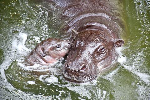 侏儒河馬「小侏」當媽媽了!去年十二月十五日,台北市立動物園五歲的「小侏」產下第一胎,寶寶就取名「侏長」,除了是「小侏」的長子,也希望牠平安長大。兩個月大的「侏長」已經從出生時的五.二三公斤穩定成長到十.四公斤,而且最喜歡跟著媽媽在水中玩耍。