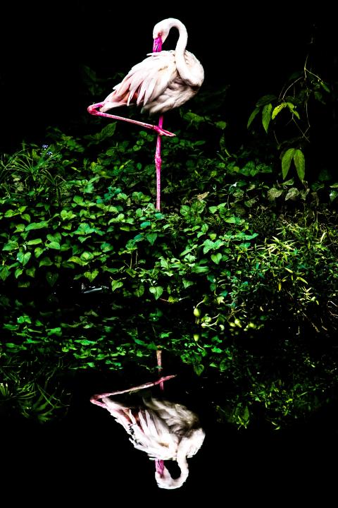 Wang says that when he was taking pictures of the flamingo there was too much foliage around the bird, which made it difficult to get a good composition. After discovering that there was a pool, he took in the reflections of the foliage in the water to create a symmetrical picture, giving the impression that the flamingo was standing on a cloud.