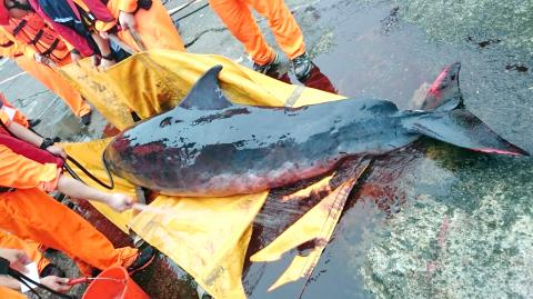 At noon on Mar. 20, New Taipei City’s Animal Protection and Health Inspection Office received a report from coast guard officers of a pygmy sperm whale stranded on Fulong Beach in Gongliao District. Animal protection officers immediately met up with members of the Taiwan Cetacean Society and researchers from National Taiwan University’s Cetacean Research Laboratory and sent out a joint rescue team.