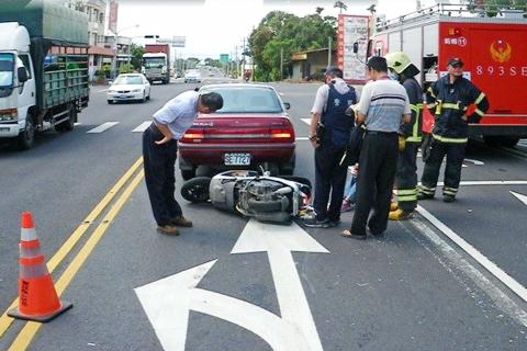 At around 10am on the morning of Monday last week, a Taiwan Power Company employee who was repairing an electricity cable at the intersection of Provincial Highway No 1 and Damei Road in Yunlin County’s Cihtong Township is suspected to have accidentally caused a cable to catch fire. The worker made an emergency call to Yunlin County Fire Department’s Cihtong Township dispatch center, which immediately extinguished the fire. The firefighters could not have anticipated that the foam-covered road would cause a scooter rider surnamed Lin who did not notice it to slide over and crash into a passenger car waiting at a set of traffic lights in front of him.
