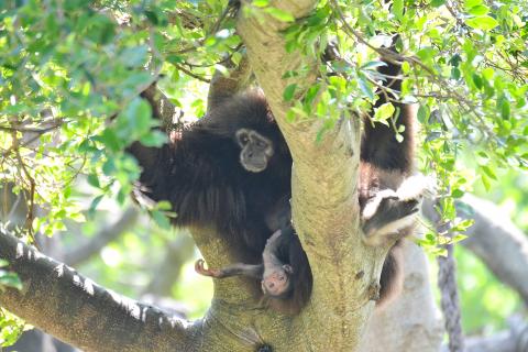 White-handed gibbons born in the wild live to about 30 years old, while those raised in captivity may live for longer. They are a protected species that is close to extinction. They are distributed across Thailand, the Malayan Peninsula, northern Sumatra and in Burma and its border with China’s Yunnan Province. They are tree dwellers and can swing three meters at a time, but they cannot swim and are afraid of water. They form monogamous pairs and give birth to one infant at a time.
